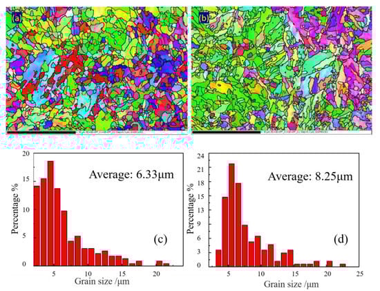 EBSD was used to analyze the size of the microstructure, as shown in Figure 12. Statistics of sizes showed that BM had a smaller grain size than the WM. The average grain size of the BM and WM was 6.33 µm and 8.25 µm, respectively. To further analyze the difference in microstructure of these two metals, the metal microstructure and particles were further identified and observed by TEM.