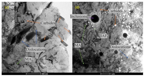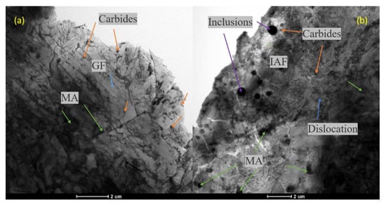 Figure 11 shows the TEM micrographs of the BM and WM. The matrix structure of the BM (Figure 11a) is a GF structure with an obvious lamellar contour and MA islands. The carbon-rich MA islands and granular carbides are distributed in the bands with some regularity. There is no obvious deformation trend in the MA islands, and there is a flocculent dislocation structure around the MA islands and carbides. Compared with the BM, in addition to GF and MA islands, the matrix structure of the WM has a more complex occurrence of radially shaped intragranular acicular ferrite (IAF) surrounding the inclusions. At lower temperature, a small amount of austenite in the tip clearance gradually accumulated carbon and converted it into MA, and the large spherical inclusion in the WM provides the core for the formation of IAF. The increased dislocation clusters around the MA islands indicates that the crystal defects in the structure were increased, which may be the reason why the WM was slightly stronger than the BM.
