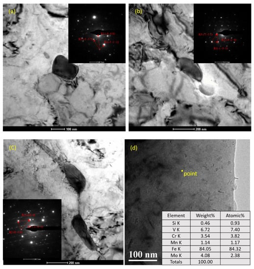 It can be seen from Figure 13 that carbides were widely distributed in the BM and WM, and the size of large particles was about 200 to 300 nm. Figure 14 was used to calibrate the main components of carbide in the BM by the diffraction spot in SAED analysis. The results show that the carbide composition in the sections shown in Figure 14a–c was M23C6, M2C, and M6C, respectively. In addition, many small granular and circular flake particles can be seen in the vicinity of the dislocation by magnification. For the finer carbide particles in Figure 14d, the diffraction spot could not be accurately carried out, so EELS was used to roughly calibrate the composition, and the result showed that the carbon and vanadium content in these carbide particles was higher than the average level of the material; it was believed that there was an enrichment of V carbide. Compared with what is reported in the literature [45], this kind of granular carbide may be VC or V4C3.