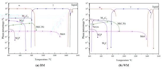 Because the products of carbide observed by TEM can only prove the existence of a certain carbide inside the metal, but not the formation time and the whole composition of carbide, JMatPro software was used to simulate the balanced cooling process of BM and WM. The chemical composition of the welded structure of BM and WM was determined, and the carbide precipitation during the cooling process of welding was simulated. The result is shown in Figure 15.