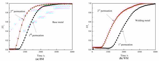 Hydrogen diffusion curve of sample BM and WM at 20 °C: (a) BM and (b) WM.