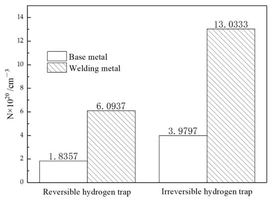 It is obvious from Figure 17 that there was a huge difference in the number of hydrogen traps between the BM and WM. It is generally accepted that dislocation is a reversible hydrogen trap. The microstructure study of the BM and WM shows that there were many dislocation cells in the WM, and the flocculent dislocation group exists in all parts of the matrix. Studies on the microstructure of the BM and the WM showed many dislocation cells in the WM and flocculent dislocation groups in all parts of the matrix, although the grain of the BM was slightly smaller than that of the WM. The rule that the number of reversible hydrogen traps was higher than that in the BM was also consistent with common sense.