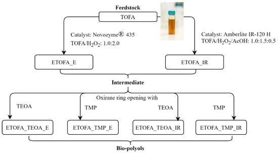 High functionality polyols were synthesised by functionalising ETOFA_IR or ETOFA_E, which were obtained by epoxidising TOFA using two epoxidation catalysts either Amberlite IR-120 H or Novozym® 435. Bio-based polyols were synthesised by opening the oxirane ring of ETOFA_IR or ETOFA_E and subsequent esterification with various polyfunctional alcohols, such as TMP and TEOA. For bio-polyols synthesised from intermediate ETOFA_IR, the following acronyms were used ETOFA_TMP_IR and ETOFA_TEOA_IR depending on the used polyfunctional alcohol for epoxide ring-opening. For polyols obtained from TOFA epoxidation with lipase catalyst Novozym® 435, the following acronyms were used ETOFA_TMP_E and ETOFA_TEOA_E. The general scheme of bio-polyol development is depicted in Figure 1.