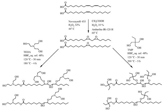 - Desroches, M.; Escouvois, M.; Auvergne, R.; Caillol, S.; Boutevin, B. From vegetable oils to polyurethanes: Synthetic routes to polyols and main industrial products. Polym. Rev. 2012, 52, 38–79. [Google Scholar] [CrossRef]