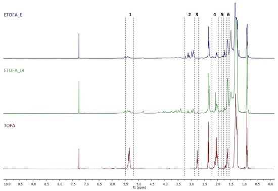 1H-NMR of TOFA and TOFA-catalysed epoxidation by ion-exchange resin (ETOFA_IR) and TOFA-catalysed epoxidation by lipase catalyst Novozym® 435 (ETOFA_E) (500 MHz, CDCl3). Abbreviations: 1—protons of double bond; 2—protons of oxirane moiety; 3—protons of bis-allylic position; 4—protons of allylic position; 5—CH2 protons of oxiran-2-yl moiety; 6—CH2 protons of bis-(oxiran-2-yl) moiety.