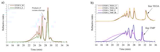 The SEC chromatograms of different ETOFA and synthesised bio-polyols are depicted in Figure 5. The oxirane cleavage products discussed in previous paragraphs were also visible in SEC chromatogram of ETOFA_IR as a shoulder of epoxidised fatty acid products at the retention time of ~29 min. The oxirane ring-opening dimerisation, trimerisation and oligomerisation products were identified at retention times of ~27, 26 and 25 min, respectively, in ETOFA of both types of epoxidation methods. Although, the higher selectivity of Novozym® 435 catalyst ensured a lower amount of dimerisation products.