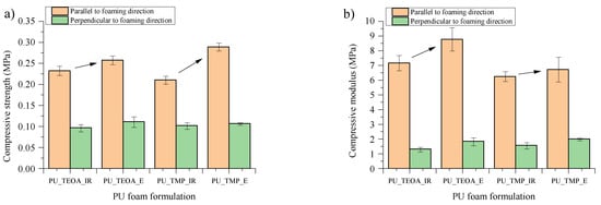 The compression strength and compression modulus of ETOFA_TEOA_IR-, ETOFA_TEOA_E-, ETOFA_TMP_IR- and ETOFA_TMP_E-based rigid PU foams were measured in parallel and perpendicular to foaming direction and are depicted in Figure 7. The data have been normalised to the average apparent density of 40 kg/m3, according to Hawkins et al. [56], to compare the mechanical properties. Developed rigid PU foams had significant anisotropicity as the mechanical properties varied depending on the testing direction. Anisotropicity is typical for rigid PU foams that are obtained in open-type mould. Rigid PU foam cells tend to elongate with the foaming direction, as seen in Figure 6. Nevertheless, the compression strength was ~0.2 MPa, which is typical for this type of material applied for civil engineering [57].