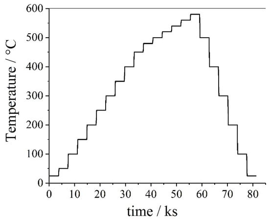 The time–temperature curve for the in situ heat treatment during the X-ray diffraction (XRD) measurements.