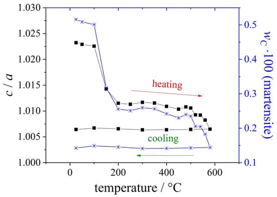 The mass fraction of carbon in martensite is estimated by measuring the tetragonality; i.e., the c/a— ratio of the tetragonally distorted unit cell of martensite. It is worth mentioning that the change of the lattice parameter in austenite allows estimating the change of the mass fraction of carbon in austenite only, whereas the c/a—ratio is directly proportional to the absolute mass fraction of dissolved carbon in martensite. Thus, the carbon mass fraction in martensite by percent (ΔwC 100 in martensite) is calculated from the tetragonality c/a. The evolution of the c/a ratio and carbon mass fraction in martensite is plotted versus temperature for a heating/cooling cycle (Figure 4).