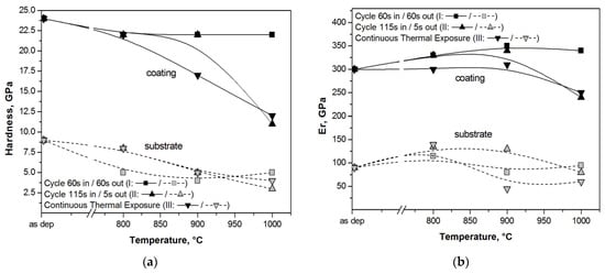 Hardness, H, (a) and Er (b) of AlTiCrxN1-x coating after thermal cycles I, II (see Figure 2), and continuous exposition for 24 h to the upper temperature range (1000 °C). The corresponding behavior of the substrate tool steel is also reported for comparison.