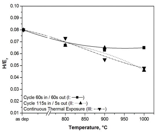 To better assess the mechanical property degradation induced by the maximum exposure temperature to the AlTiCrxN1-x coating on tool steel, a technologically meaningful approach is given by the H/Er ratio. This quantity, indeed, provides an estimation of the coating’s ability to be deformed by pressure without damage [,]. The H/Er quantity refers to the ratio between the plastic work and the total work in an indentation contact, also referred as to the plasticity index (PI) and expressed as [] PI = 1 − η⋅(H/Er), where η = 6.4. It is generally agreed that the PI represents a valid tool to assess the degree of coating degradation. In this regard, the H/Er trend with testing temperature can give an estimation of the resulting coating degradation. Figure 11 shows plots of the H/Er ratio against thermal exposition by cycles I, II, and continuously, up to 1000 °C.