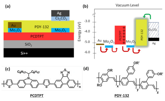 The LEFET devices were fabricated using a 300 nm thermally grown layer of SiO2 as a dielectric on Si substrates. The substrates were cleaned by ultrasonication in acetone and isopropanol alcohol (IPA) for 15 min each and then blow-dried under pressurized nitrogen. An 80 nm layer of charge transport polymer poly [4-(4,4-dihexadecyl-4H-cyclopenta [1,2-b:5,4b′] dithiophen-2-yl)-alt-[1,2,5] thiadiazolo [3,4-c] pyridine], PCDTPT, was then spin-coated onto substrates from a 5 mg/mL solution in dichlorobenzene. Substrates were then annealed at 150 °C for 30 min. Using an aligned shadow mask-1, a hole injecting asymmetric source contact, consisting of a 10 nm of Mo2O3 layer and 50 nm of Au layer, was deposited on top of the PCDTPT layer by thermal evaporation in a high vacuum. A 10 nm layer of Mo2O3 was also deposited using the aligned drain mask-2, to be exactly underneath the drain electrode. A 100 nm layer of polymer PDY–132 was then spin-coated onto the entire substrate from a solution of 10 mg/mL in toluene. The substrates were annealed again at 150 °C for 30 min. Finally, the electron-injecting semitransparent drain electrode, consisting of 10 nm of Cs2CO3 and 20 nm of Ag layers, was deposited through aligned shadow mask-2 to give a channel length (L) and width (W) of 100 µm and 2 mm, respectively. The complete device structure is shown in Figure 1a and the energy level diagram with charge injection schematics is shown in Figure 1b, along with the molecular structures of PCDTPT in Figure 1c and PDY–132 in Figure 1d.
