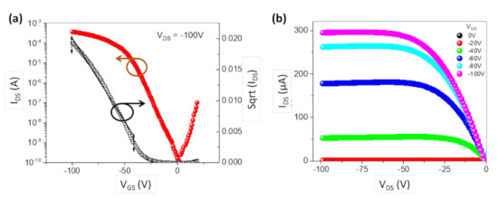 Figure 2a,b shows the transfer and output characteristic curves of the LEFET, respectively. A current ON/OFF of >106 was achieved in the saturation regime. The charge carrier mobility (µ) in the saturation regime was calculated from the transfer characteristics given in Figure 2a using Equation (1).