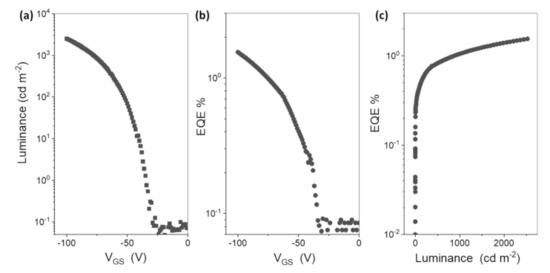 Figure 3a shows the optical transfer characteristics of luminance vs. gate voltage of the LEFET device. Bright yellow light emission of the peak luminance of 2600 cd m−2 was observed under the drain electrode. An EQE of 1.6%, as shown in Figure 3b, was estimated at a high luminance of 2600 cd m−2. The EQE vs. luminance graphs in Figure 3c showed an increase in EQE trend, which is an exciting feature and needs a follow-through in LEFET devices. Usually, at high brightness, the EQE tends to roll-off and decrease with increasing current density. However, the LEFET structure has been reported to lower this roll-off of EQE [34] as observed in these results. The results are summarized in Table 1. The calculated luminous efficiency at maximum current density (or gate voltage of 100 V) was 3.2 lm per Watt.