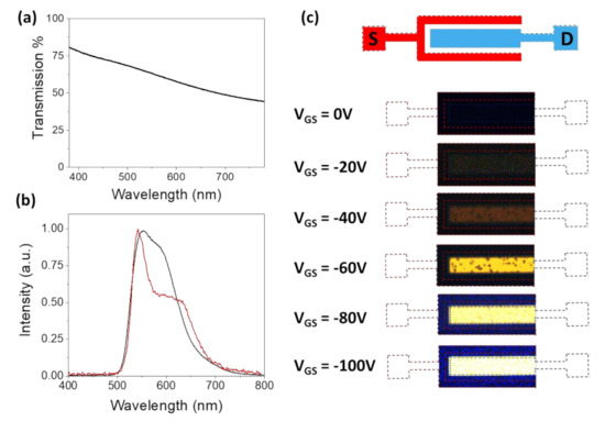 - Chaudhry, M.U.; Tetzner, K.; Lin, Y.-H.; Nam, S.; Pearson, C.; Groves, C.; Petty, M.C.; Anthopoulos, T.D.; Bradley, D.D.C. Low-voltage solution-processed hybrid light-emitting transistors. ACS Appl. Mater. Interfaces 2018, 10, 18445–18449. [Google Scholar] [CrossRef]