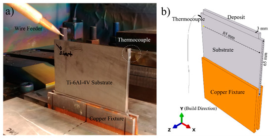 A series of single bead thin wall structures were fabricated using a wire-fed 42 kW Sciaky EBAM and welding system (Sciaky, Chicago, IL, USA) under 5 × 10−3 Pa (5 × 10−5 mbar) vacuum at the Aerospace Manufacturing Technologies Centre of the National Research Council of Canada in Montreal, Canada to emulate additive processing. Timetal Ti64 (AMS4911M) wrought plates (Timet, Warrensville Heights, OH, USA) were used as the substrate in the deposition experiments. Substrate plates were cut with dimensions of 85 mm in width, 65 mm in height, and 3 mm in thickness. The height of the substrate was oriented parallel to the rolling direction (RD) of the plate. The top (deposition) surface of the substrate was ground with 120 grit SiC paper and cleaned with acetone prior to deposition. Temperature measurements were undertaken using a 0.5 mm diameter K-type thermocouple attached to the side of the substrate. To attach the thermocouple, a hole, approximately 1 mm in diameter, was drilled roughly 3 mm away from the top surface (Figure 1). Timetal Ti64 (AMS 4954) filler wire with a 0.9 mm diameter was used for deposition. The chemical compositions of the wire and plate are given in Table 1. In the experiment, a bi-directional scan strategy was used where subsequent layers have opposite scanning directions. Ten successive layers were deposited to produce a 5 mm build height (500 μm layer thickness). One of the experiments was stopped after depositing a single pass/layer to have a snapshot of the microstructure and residual stresses for the first layer as a point of comparison. The photograph and the schematic in Figure 1 show the substrate geometry and experimental setup. The travel speed and wire feed rate were set at 3.81 mm/s and 8.5 mm/s, respectively. Samples were cooled down to room temperature under vacuum.