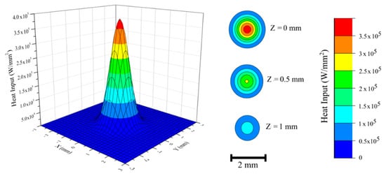 The high-density electron beam heat source was modeled as a conical volumetric heat source [33] with a Gaussian distribution, as illustrated in Equation (2). The intensity distribution profile was adopted and modified from the equation modeled by Rouquette et al. [34]: