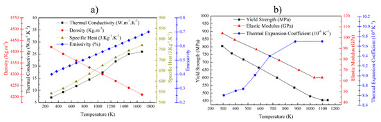 Temperature-dependent material properties used in FEA simulations: (a) thermal and (b) mechanical properties [30,37].