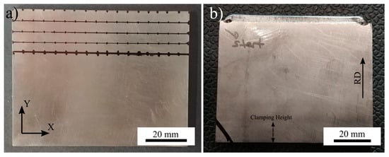 Images of the Ti-6Al-4V substrate (a) before and (b) after deposition experiment. Grid points used for XRD residual stress measurements are shown.