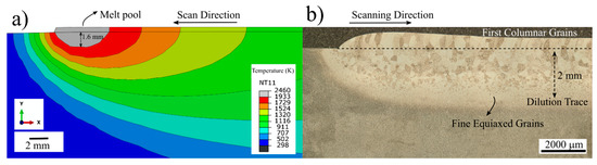 (a) Predicted temperature profiles showing melt pool depth during first layer in 2D and (b) optical microscope (OM) micrograph of the single layer sample that reveals dilution trace.