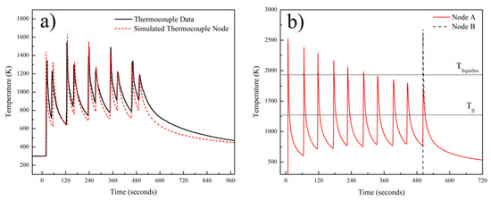 Transient thermo-mechanical simulations can yield valuable information such as temperature fields, distortion, and residual stresses as a function of process time and position. However, the reliability of such information needs to be evaluated with a series of validation experiments. Contour plots exported from ABAQUS™ in Figure 6 show the predicted temperature distributions during deposition of the first and the last layers. The thermal history of some nodes was used for validation of the model. The thermocouple node, which was selected according to the position of the real thermocouple in the experiment, is shown in Figure 6a. Similarly, nodes A and B, which are on the mid-width of the first and the last layers, are illustrated in Figure 6a,b, respectively.