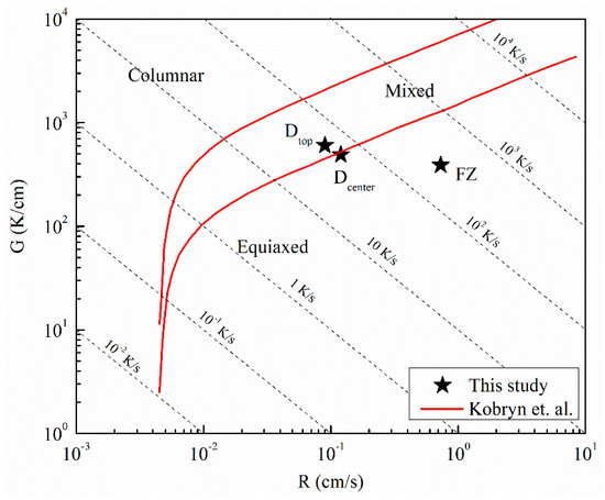 The Ti-6Al-4V solidification map [45] showing the calculated G and R values from various regions of the sample: Dtop (top of the deposit), Dcenter (mid-height of the deposit) and FZ (fusion zone).