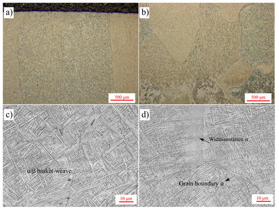 Higher magnification OM micrographs of the 10-layer Ti-6Al-4V sample from (a,c) first layers and (b,d) last layers of the deposit.
