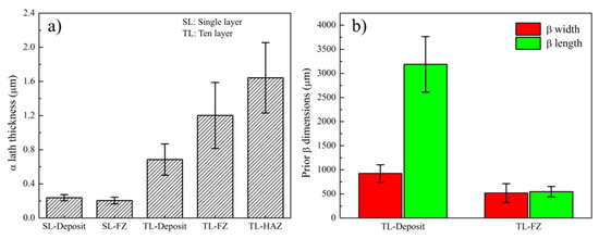 Plots showing dimensions of microstructural features such as (a) α lath thickness and (b) prior β dimensions for the single layer and 10-layer Ti-6Al-4V samples.