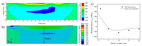 Residual stresses in AM processes mainly develop because of the thermal cycles experienced with the addition of new layers. Local differences in temperatures and their corresponding non-uniform volume expansions and contractions result in their development [1,21]. Figure 13 shows the measured and predicted residual stresses along the scan direction (x) for the single layer sample. Residual stresses were compared along the scan direction (x) since they were the highest and dominant residual stress on the substrate. Residual stresses beyond 20 mm distance from the deposit/substrate interface are not shown since they were relatively low (0–10 MPa) and considered negligible. Experimental residual stresses developed in the substrate shown in Figure 13a were measured using XRD from each of the pen marks depicted in Figure 5a. Corresponding predicted residual stresses are given in Figure 13b with the exported image from ABAQUS™. A residual stress color scale was adjusted to be similar to the one in Figure 13a for visual comparison. Residual stresses above 400 MPa, as shown in the gray zone, were only calculated on the deposit. Thus, the following observations and discussions can be derived from the results of the single layer sample. First, predicted and measured residual stress contour plots are in good agreement. The residual stresses are highest along the scan direction, concurring with previously reported findings in the literature for AM parts [1,56]. The deposit and HAZ on the substrate are under tension, while the core of the substrate is under compression for the single-layer sample. The highest tensile residual stress on the deposit and the substrate are approximately 800 (1.0σys) and 400 (0.5σys) MPa, respectively. Similarly, in the literature, the ratio of the maximum residual stress to the alloy yield strength at room temperature for Ti-6Al-4V deposits were reported to be around 1.0 σys [25]. The results also showed that the depth of the tensile residual stress region is approximately 4 mm from the substrate surface, which is similar to the HAZ depth. Due to the heating, during the new layer deposition, the deposited material and HAZ expand as its yield strength decreases. However, this expansion is hindered by the cooler substrate material. Thus, compressive stress is observed on the substrate material. Due to subsequent cooling, the deposited material and HAZ try to contract. Contraction is again obstructed by the surrounding material. Although contraction is easier initially due to the lower yield strength at elevated temperatures, it becomes harder as the part cools down. This results in a tensile stress in the deposited material and HAZ [21]. Figure 13c shows the measured and predicted residual stresses along Path 1, as shown in Figure 13b. The predicted residual stress profile has a decent fit with the experimental data points. The highest error was observed to be at the deposit/substrate interface, near x = 0 along Path 1. The measured residual stress at this point is approximately 100 MPa higher. One possible reason for this error could be the overflow of the deposited material to the substrate in the experiment, which was not simulated in the model.