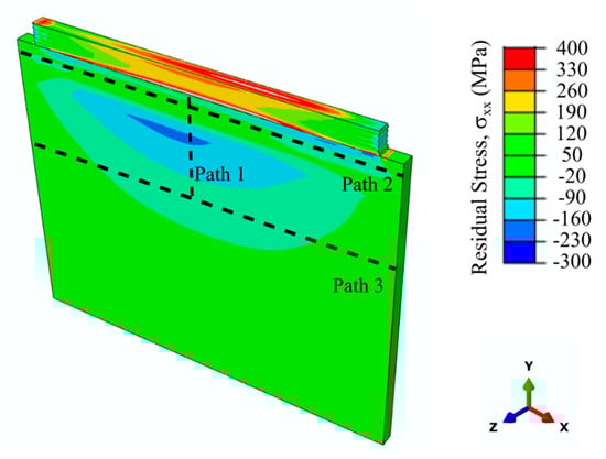 The predicted residual stresses along the scan direction (x) for the 10-layer Ti-6Al-4V sample and pre-defined three paths are shown in Figure 14. A residual stress profile similar to the single layer sample was calculated for the 10-layer sample. A compressive stress region is located at the core of the substrate just below the HAZ, while most of the deposit is under tension. Tensile residual stresses were calculated to be higher at the interface or at the top and mid-width of the deposit. The highest calculated tensile residual stress was approximately 400 MPa in the deposit. Predicted residual stresses were considerably lower for the 10-layer sample compared to the single layer sample. The major reason of this phenomenon is the stress relaxation and softening in the 10-layer sample due to subsequent heating cycles and longer heat exposure. Another affecting factor for such phenomenon can be that the single-layer sample was deposited on the cold substrate at the room temperature, while the last layer of the 10-layer sample was deposited on a surface, which was already relatively hot. This could work as a pre-heat treatment before processing [57]. It was previously reported in the literature that the elevated temperatures and reduced temperature gradients experienced during EBAM processing are the main basis of the low residual stresses on the substrates [49]. The second affecting factor that could influence the residual stresses are the solid-state phase transformations occurring due to the multiple thermal cycles [30,58]. Denlinger et al. stated that volumetric changes due to allotropic phase transformations cause transformation strains within the alloy. These strains could potentially oppose contraction strains during cooling and relieve residual stresses [27,30]. Similarly, Elmer et al. studied the lattice expansions of Ti-6Al-4V during allotropic transformations via in situ high-energy synchrotron X-ray radiation and found that α and β phases have dramatically different changes in their lattice parameters during allotropic transformation. These differences in lattice parameters and thermal expansion behaviors are considered to be the origin of the stress relief in Ti-6Al-4V during allotropic transformations [58]. The residual stress profiles encountered in this study for the thin wall substrate were found to be similar to the ones in the literature for the bulky substrates [25]. Mukherjee et al. showed the evolutions of the residual stresses progressively in each layer. Their study revealed a compressive stress region on the substrate below the HAZ and a tensile stress region on the deposit. This tensile region was most pronounced at the mid-width of the deposit. Each layer deposition resulted in the tensile region shifting to an upper layer on the deposit. Residual stresses on the previous layers were stress relieved partially because of the heating during the process [25]. These findings are in good agreement with the residual stress evolution observed from the single layer to the 10-layer sample of this study. Figure 14 shows a gradual increase in the predicted tensile residual stresses with each layer, further highlighting the shift in residual stresses with each pass. Residual stresses in the 10-layer sample were further compared with the experimental measurements using the pre-defined paths shown in Figure 14. Path 1 extends 20 mm from the deposit/substrate interface to the substrate at the mid-width of the substrate. Path 2 and Path 3 are located approximately 1 mm and 20 mm away from the interface, respectively.
