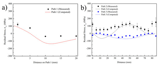 Predicted and measured (XRD) residual stress comparison plots along scan direction on (a) Path 1 and (b) Paths 2 and 3 for 10-layer Ti-6Al-4V substrate.