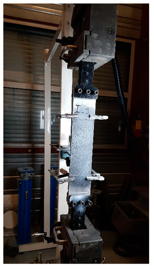 In order to guarantee a uniform load transfer and to prevent stress localization within the clamping regions, four aluminium plates (125 mm × 100 mm × 5 mm) were glued using an epoxy structural adhesive (Sikadur 31-EF) at the loaded ends of specimens. During the tests, the tabs were clamped within the wedges of the testing machine. The pressure was adjusted to prevent slippage between the clam and the specimen. Two clamps were also used to avoid delamination between the specimens and the lower ends of the aluminium plates [15], as shown in Figure 2.
