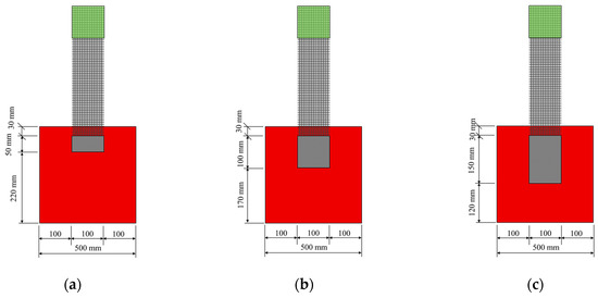 Bond specimen geometries for the anchoring length of: (a) 50 mm, (b) 100 mm, and (c) 150 mm.