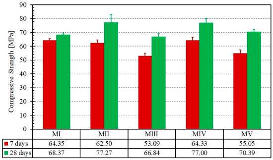 Compression test results for the five mortar formulations at different curing times. Error bars represent the standard deviation of the mean.