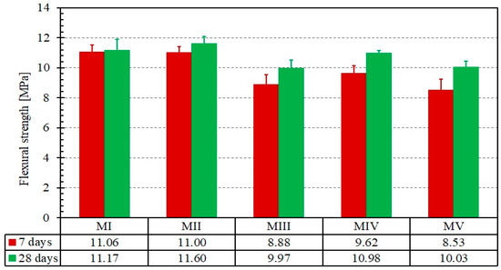 Flexural test results for the five mortar formulations at different curing times. Error bars represent the standard deviation of the mean.