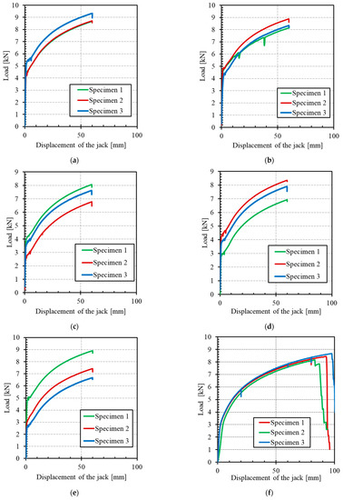 Load–displacement curves for the tensile specimens: (a) formulation MI, (b) formulation MII, (c) formulation MIII, (d) formulation MIV, (e) formulation MV, and (f) stainless-steel grid (SSG).