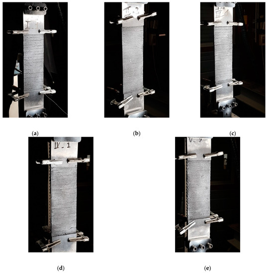 Cracking pattern of the tensile specimens for the different mortar formulations: (a) formulation MI, (b) formulation MII, (c) formulation MIII, (d) formulation MIV, (e) formulation MV.