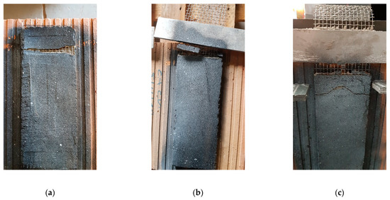 Figure 9. Failure mode of the specimens of the mortar formulations: (a) MI, (b) MII, and (c) MIII. - Debonding of TRM from the clay substrate without peeling off parts of the clay brick (as shown in Figure 10). Here, the TRM composite remains almost intact after failure and detaches from the substrate as a single body.