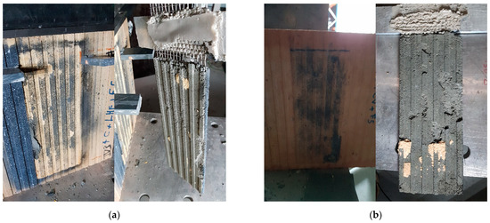 - Mixed failure mode: tensile rupture of the steel grid out of the bonded area with mortar splitting at the loaded end. The failure was initiated by the formation of a single transversal crack on the top part of the bonded area (at an early stage of loading). This crack opened further at the end of the test and the top 1–3 cm of the matrix detached completely from the clay brick. The development of this crack can be explained by the textile elongation within the mortar matrix during the elastic behaviour stage. The rest of the interface was visibly intact, and no cracks/separation was observed. Finally, the failure was ended by rupture of the longitudinal steel cords progressively. This might be attributed to the bonding capacity between fabric and mortar matrix as well as the adherence between composite (fabric and mortar) and clay brick [6,13]. Examples of this failure mode are shown in Figure 9.
