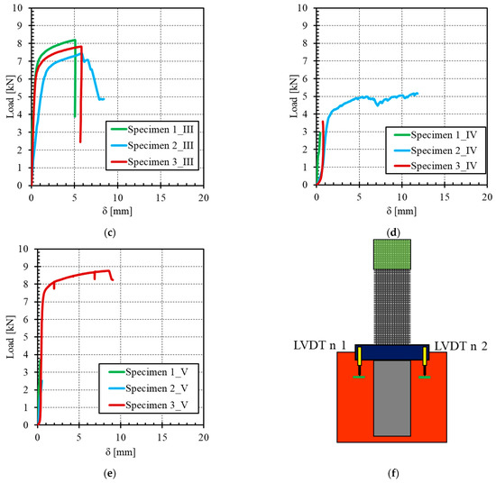 Load–relative displacement between SSG and clay brick for the different mortar formulations: (a) formulation MI, (b) formulation MII, (c) formulation MIII, (d) formulation IV, (e) Formulation MV, and (f) locations of the LVDTs.