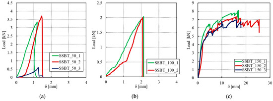 The average results of all the tested specimens are presented in Figure 12. Here, “SSBT” denotes the shear bond test, “50, 100, and 150” denote the anchoring length in millimetres, while the last number denotes the sample number. The mean peak load, mean maximum relative displacement (slip) measured by the LVDT, exploitation ratio, and ultimate shear of each anchoring length are summarized in Table 5. The ultimate shear stress was calculated by dividing the ultimate load at failure by the bonded area.