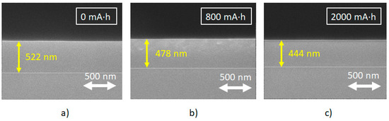 The reduction of the film volume is undoubtedly important for the utilization of the hydrogenated Si-DLC film. As mentioned in Section 2.3., we observed the change in film thickness in three different ways. Examples of cross-sectional observation of the hydrogenated Si-DLC films by SEM are shown in Figure 1.