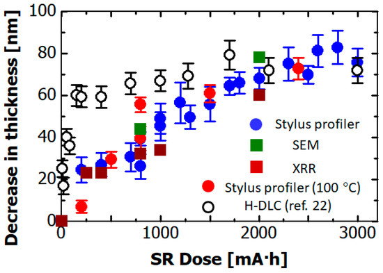 Synchrotron radiation (SR) dose dependence of the reduction in film thickness of the hydrogenated Si-DLC film measured with a stylus profiler (blue circles), SEM (green squares), and X-ray reflectivity (XRR, brown squares). Red circles indicate reductions in film thickness acquired by the stylus profiler in case of substrate heated to 100 °C with a heating system. Open circles indicate reductions in the film thickness of non-doped hydrogenated DLC (H-DLC) film after SR exposure [22].