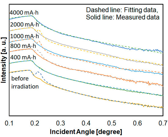 Film density is an important index to distinguish the volume change of film due to photoetching or shrinkage. Since it is thought that these densities have a distribution in the thickness direction, there were some samples that could not completely satisfy the fitting, especially at an angle slightly higher than the critical angle. Some samples also could not be completely fitted by single Si-DLC layer model. Therefore, profiles of Si-DLC films were fitted by a one-layer model as much as possible around the critical angle. Figure 3 shows the XRR profiles and fitting results. XRR analyses were performed using X’ Pert Reflectivity software (Phillips, Amsterdam, Nederland).