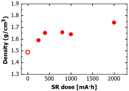 Dependence on SR dose of density of hydrogenated Si-DLC film. The open circle indicates density of hydrogenated Si-DLC film before SR irradiation.