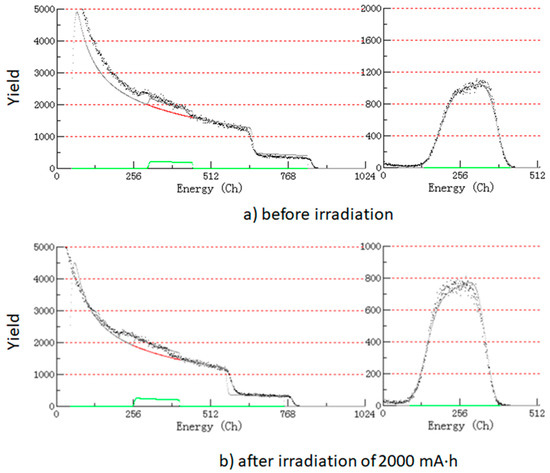 Rutherford backscattering spectrometry (RBS) profile (left side) and elastic recoil detection analysis (ERDA) profile (right side) of (a) Si-DLC film before irradiation and (b) Si-DLC film after irradiation of 2000 mA·h.
