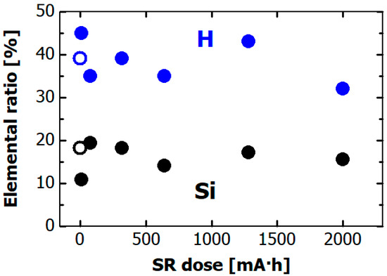 Dependence on SR dose of elemental composition ratio in hydrogenated Si-DLC film, as estimated by ERDA and RBS. Blue and black circles respectively indicate hydrogen and silicon ratios. The open circle indicates hydrogen and silicon ratios before the SR irradiation.