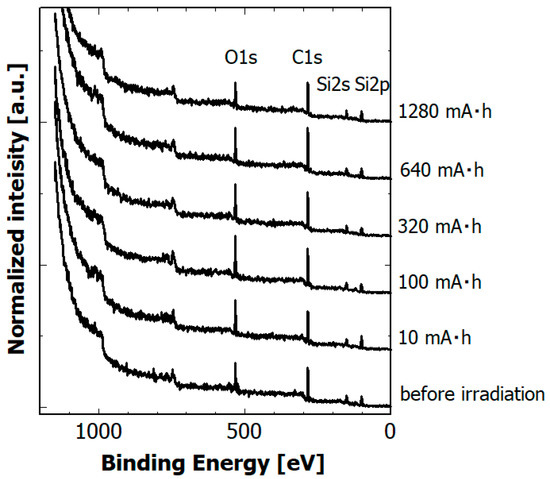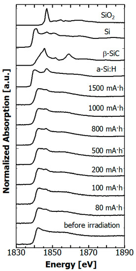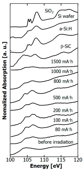 The Si-L edge NEXAFS spectra of the hydrogenated Si-DLC film before and after irradiation are depicted in Figure 12 together with those of SiO2 powder, Si wafer, a-Si:H film, and β-SiC powder. In the spectra of the Si wafer and a-Si:H film, peaks derived from SiO2 due to native oxidation were observed at 106 eV [44]. In the range of 0–800 mA·h, the intensity of the peak arising from SiO2 increased, while it decreased at doses greater than 1000 mA·h, as in the Si K edge spectra.