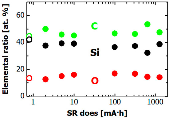 Dependence on SR dose of the elemental ratio of hydrogenated Si-DLC film surface as measured by XPS. Black, green, and red circles respectively show silicon, carbon, and oxygen contents. The open circles indicate carbon, silicon, and oxygen contents before the SR irradiation.