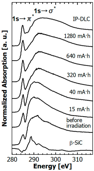 The C K edge NEXAFS spectra of the hydrogenated Si-DLC film before and after SR irradiation are depicted in Figure 9 together with those of β-SiC powder and typical commercial DLC film. The commercial film was deposited on 200-nm-thick Si wafers using the ion plating method, referred to as IP-DLC film hereafter. The IP-DLC film consisted of only carbon and hydrogen without silicon or other hetero-elements. The hydrogen content of the IP-DLC film was estimated to be ~20% from a combination of ERDA and RBS measurements.